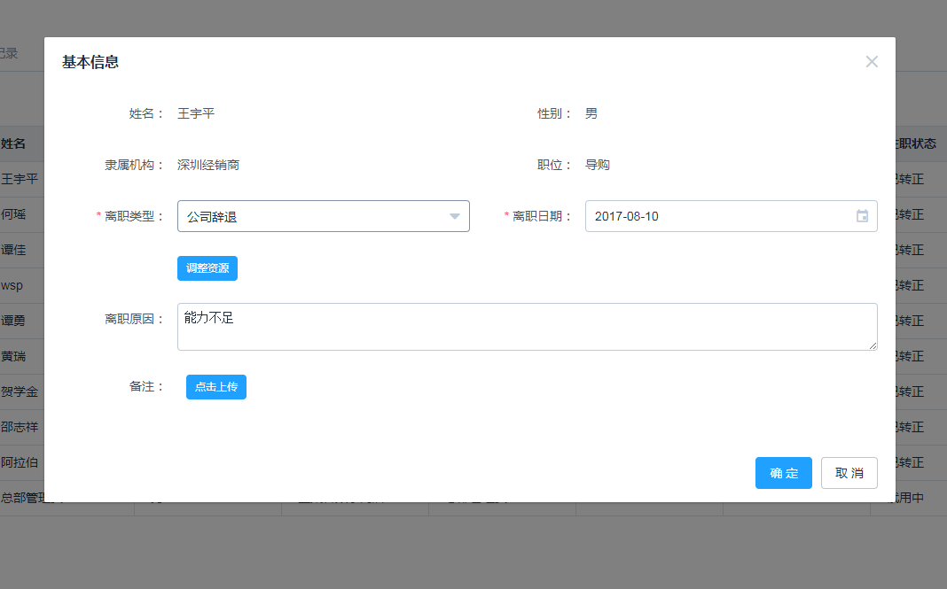 目录 搜索 目录认识数字门店认识scrrm工具界面介绍人员管理入驻与审核人员离职公文通知商品管理pc端操作发布、下载商品编辑及上下架移动端操作下载商品发布商品商品管理店铺管理店铺资料设置店铺装修营销活动优惠卡券报名活动文章管理群发客户管理订单管理录入订单确认订单订单流程管理数据统计我的事务 暂无相关搜索结果! 本文档使用 MinDoc 发布 人员离职 人员离职店铺人员离职后,我们需要在scrm系统中把相应的人员账号关闭,以保障数据安全。 STEP1人员离职需登录pc端后台,找到OA模块; STEP2在离职页面,右侧出现人员列表,点击右侧调整按钮,录入离职类型、时间、原因,确定即可。 利用调整资源按钮,可以把离职人员的粉丝、客户、订单分派给自己公司的其他导购。 离职后的员工将无法进入系统。 其他在PC端OA模块,还有转正、调岗,您可以选择性使用,这些功能的使用方式与离职相似。